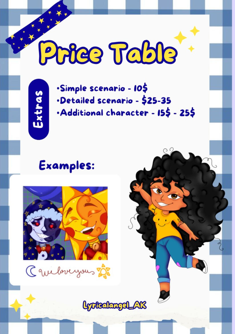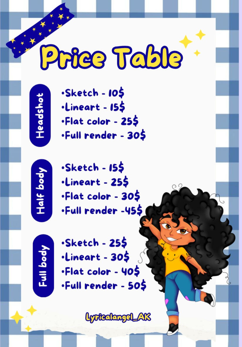 Please carefully read the price list on my social media, Carrd, or the one mentioned in the email.